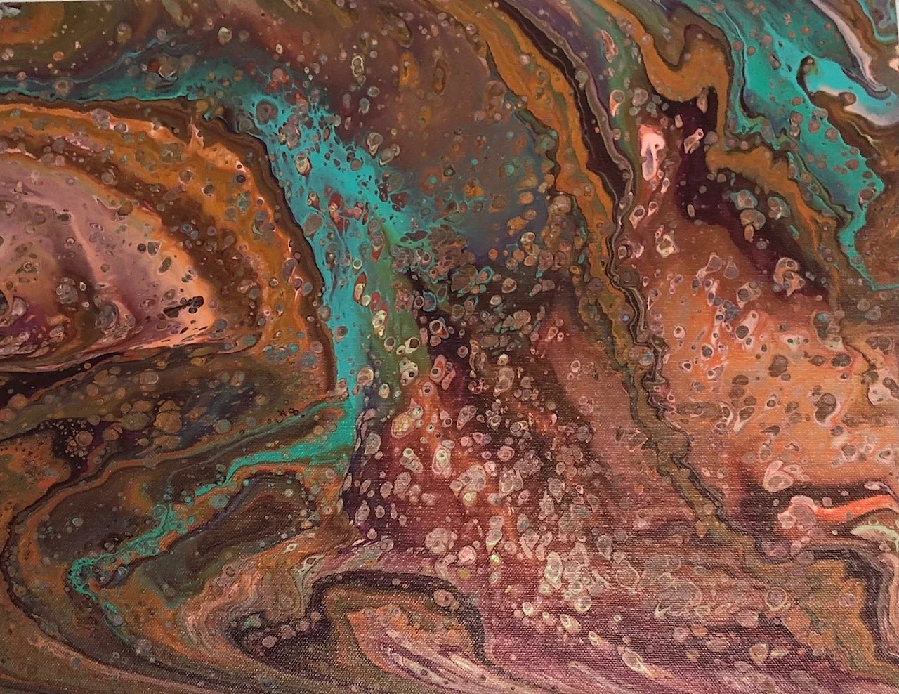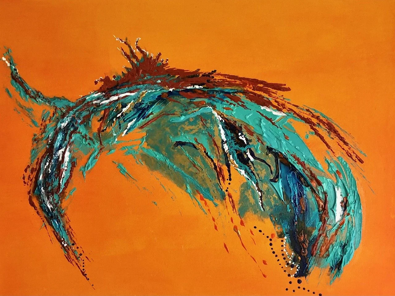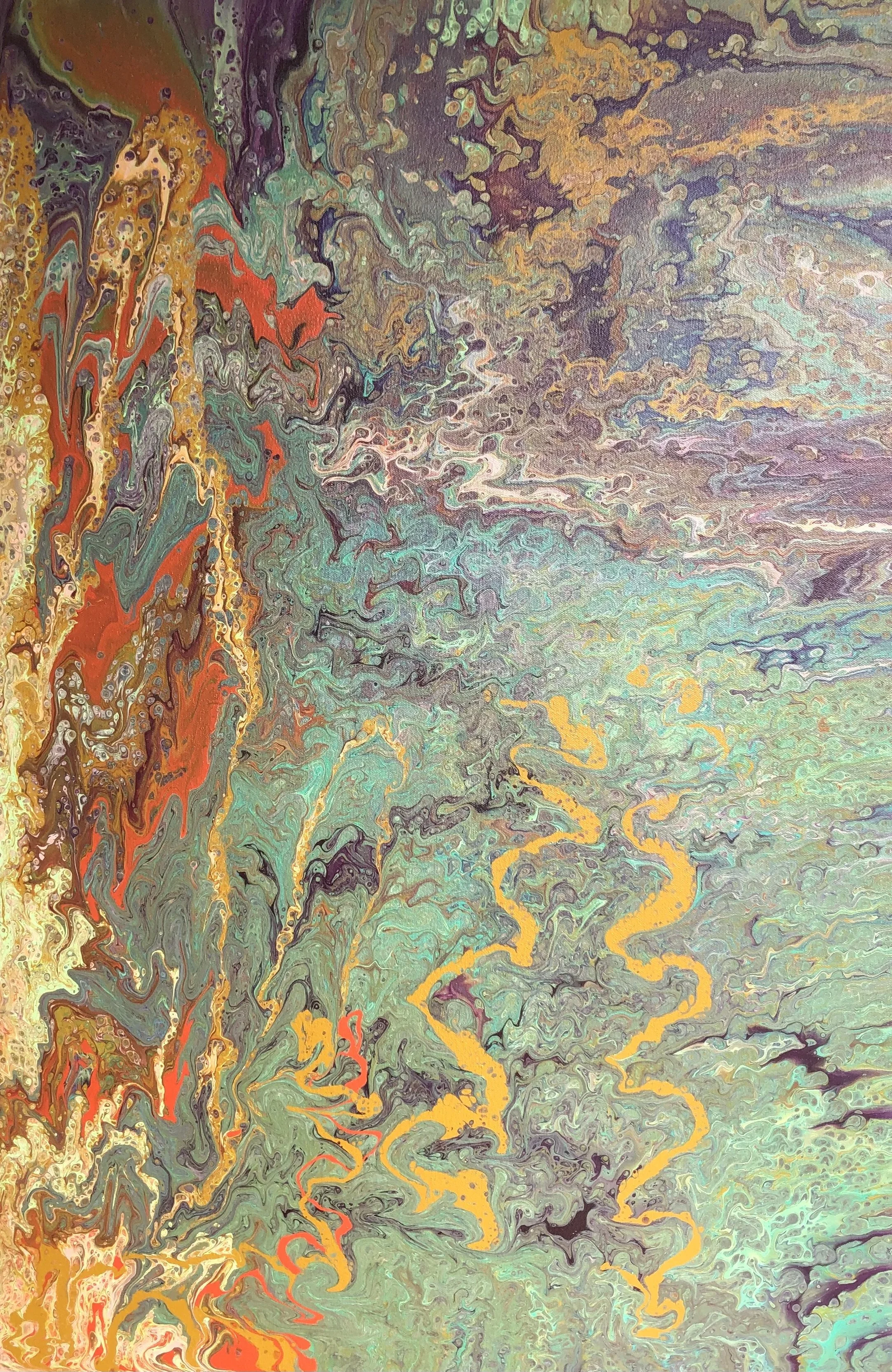 Vast sweeps of pigment flow like shifting tides, where hues converge and dissolve in endless rhythm. The piece evokes the boundless movement of the sea, fluid, powerful, and ever-changing, an abstract expanse alive with depth and energy.