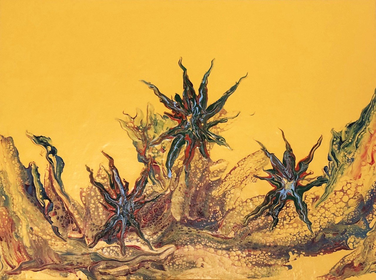 Mustard, green, blue, and purple ripple through with this under sea adventure, forming a fluid shape that hints at sea creatures in motion. The piece evokes both strength and fluidity, capturing the essence of nature’s creatures as they emerge from color, pattern, and flow